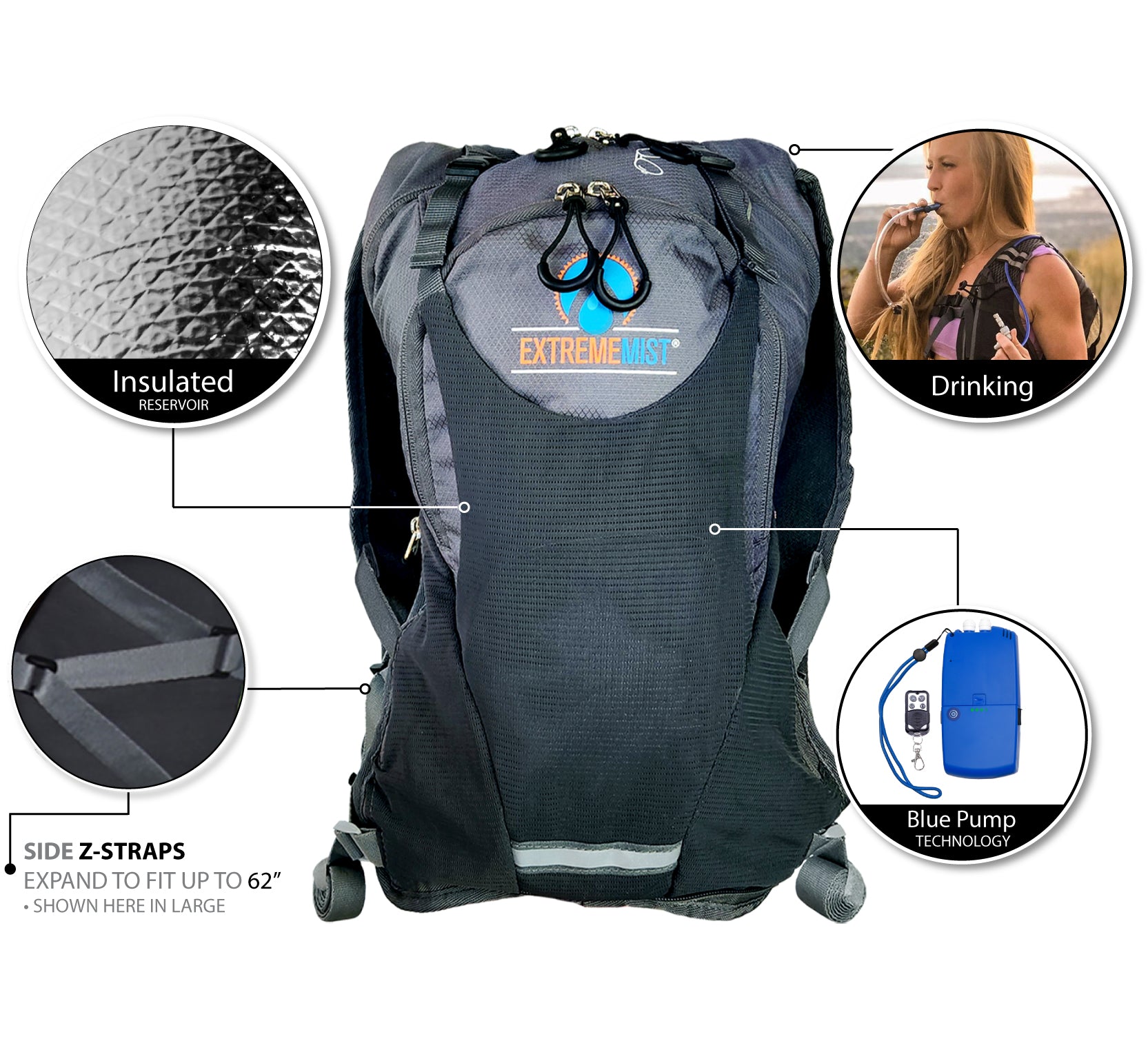 Scorching days on the trail, pedaling through the dry summer heat, or trail running in the blazing sun can quickly turn a fun outdoor adventure into a miserable, even dangerous situation. In demanding conditions, maintaining hydration is paramount, but staying refreshingly cool is equally crucial. The ExtremeMist® Misting and Drinking Hydration Backpack is the only pack on the market that delivers both.